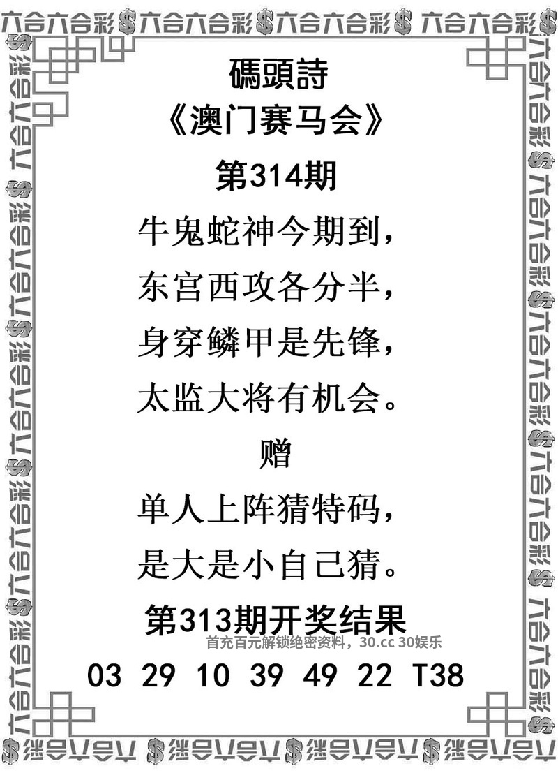 | 314期六肖 | 鸡狗猪猴羊马 | 羊23中 |