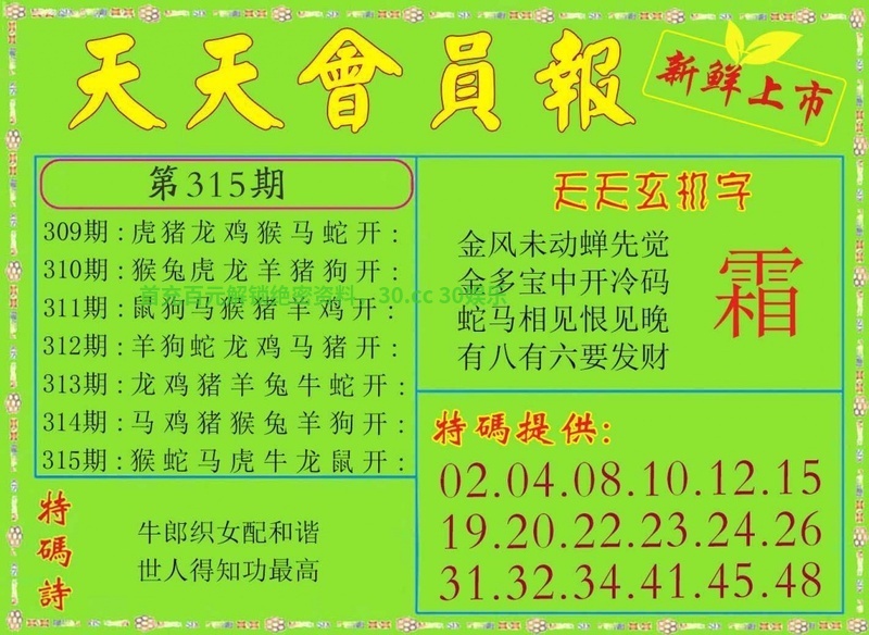 | 315期七肖 | 猪马羊猴鸡鼠牛 | 發00中 |